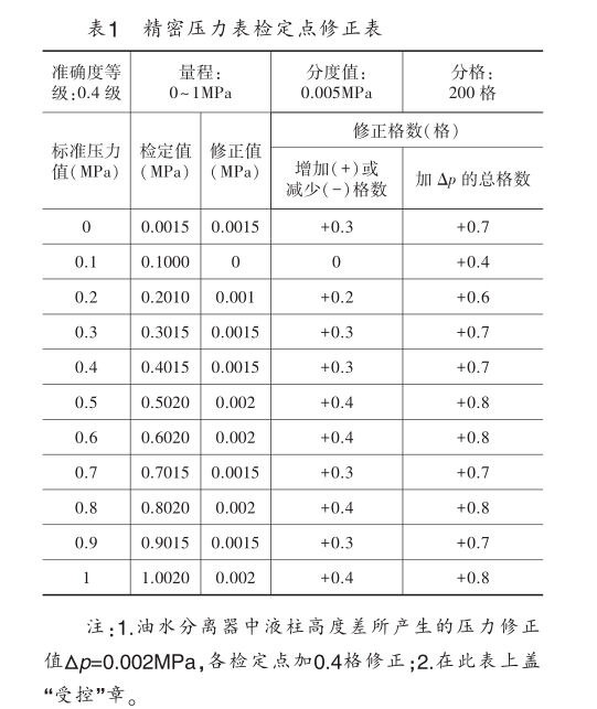 表1 精密壓力表檢定點修正表