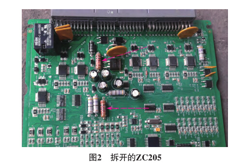 在駕駛室左側門窗下找到了ZC205,打開后蓋,發現其 上的電子元件結構如圖2所示,其中有2個電阻元件已經發 熱變色了。用電烙鐵分別燙取變色電阻的后,測量電阻正 常,重新焊好已變色電阻,將ZC205裝在正常車上試驗,儀 表工作正常,說明ZC205正常。