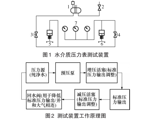 水介質(zhì)壓力表測試裝置是由水介質(zhì)高壓壓力源、 油水隔離器和標(biāo)準(zhǔn)數(shù)字壓力表組成,如圖1所示。測試 裝置丁作原理圖如圖2所示。