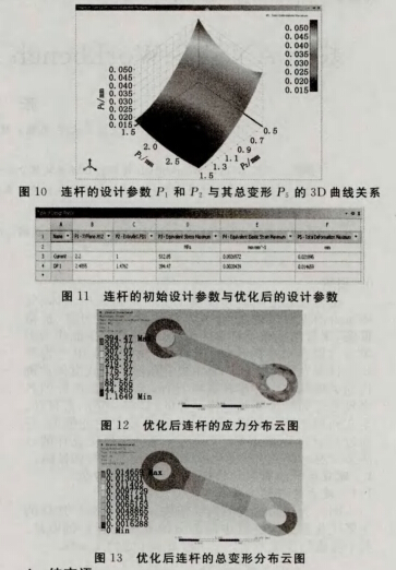 對連桿進行目標驅動優化,得到如圖10所示的響應曲面。該響應曲面是通過有限的設計點擬合成的, 設置模型為3D顯示,其中X軸代表P,Y軸代表P2 Z軸代表,從而直觀地得到了連桿的厚度與寬度對 其總變形的影響。在其三維曲面上選取連桿總變形較 低的點作為響應點*然后將得到的響應點作為優化后 的設計點,A 為 2. 485 5 mmP2 為 1.476 2 mm 桿的初始設計參數與優化后設計參數如圖11所示,優 化后連桿的最大應力見圖12.最大總變形見圖13。