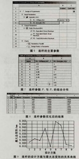 連桿的主要參數如圖6所示,其中P,為連桿中 間部分的寬度P2為連桿的厚度為連桿的最大應 力,為連桿的最大應變,愾為連桿的最大總變形。 P]和巧為輸入參數,Pi設置為1. 5 mm~3 mm的連 續變量,設置為0. 5 mm?1. 5 mm的連續變量; P3,P,,P,為輸出參數。P:與尸2的組合分布如圖7 所示,共有9種組合方案。進行靜應力分析后更新所 有設計點設計組合方案),得到如圖8所示的結果。 9為連桿的最大總變形與設計方案之間的關系。