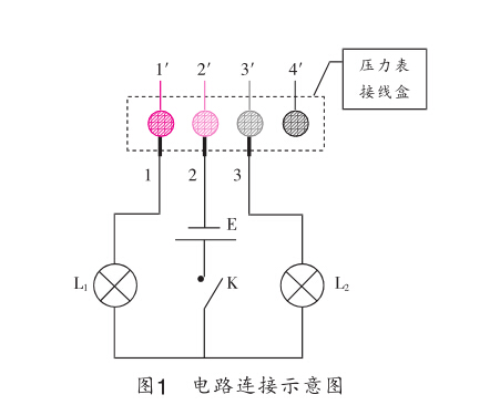 可事先將上述元器件按如圖1所示電路圖連接: 其中L和^為小燈泡,ES干電池(組),K為開關。1、2 和3為3個預留接線頭,檢定時分別與電接點壓力表的 上限接線端(1')、公共端(2,)和下限接線端[3’)相連 接(4’為電接點壓力表的接地端)。