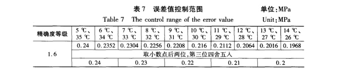 壓力表量程為0 ~ 1. 0 MPa,精確度為2. 5級,基本誤差值在為15 V ~客25冗時,為0.05 MPa,其他溫度下誤差值的判斷見表3規定.