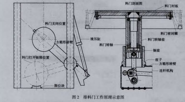 針對排料門無需全部大打 開的實際情況,把原來復雜的連用原排料門和方箱形轉臂.在排 料門下方的方箱形轉臂底部的 檢修蓋處安裝一個帶法蘭的小 行程液壓缸,液壓缸活塞桿末端 通過螺紋與排料門的轉軸套相 連接,通過活塞桿的伸縮直接驅 動排料門上下動作’實現排料門 的開關(圖4)。