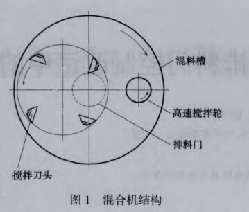 DE混合機(圖1)主要由1個圓筒狀的混料槽(DE18的料 槽直徑為1800mm,DE22的料槽直徑為2200mm)、l個高速攪 拌輪和1組攪拌器(DE18為3個攪拌刀頭、DE22為4個攪拌 刀頭)及排料門組成。