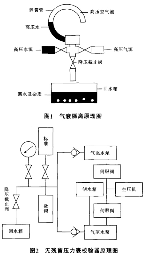 檢定壓力表后之所以有液體殘留是因為其彈簧 管是個形似秤鉤的盲管,如圖1所示。盲管的特點是一 頭開口一頭封閉,其內充滿液體后即使口朝下也不會 流出。要想使液體自動排出必須有一股外力從彈簧管 頂端推動,該校驗器采取了先充人一定壓力的空氣, 再充人一定壓力的水液的方法進行檢表,即氣液隔離 法。其原理如圖1所示。這樣壓力表降壓歸零后高壓氣 泡將水液徹底排出。該項設計既消除了直接用高壓氣 檢表的危險性,又降低了制造高壓氣的成本,還可有 效防止水液殘留。