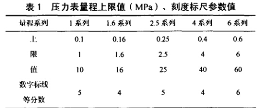 (2)常見壓力表量程上限值(MPa)、刻度標尺參數值, 如表1。