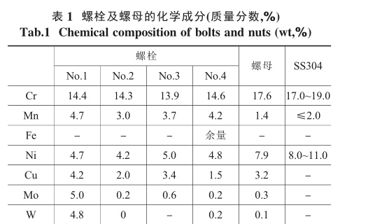 采用直讀光譜儀對螺栓及螺母進行了化學成分 分析,結果如表1所示。可看出,雖然螺母的化學成 分基本符合SS304標準材料的要求,但是螺栓螺桿 部分的鉻、鎳含量均低于國標中SS304的要求,錳 含量又高于SS304的要求。這就表明,斷裂的螺栓 為化學成分不合格螺栓。由于鉻、鎳可以提高鋼基體的電極電位,提高不銹鋼的耐腐蝕能力。同時,鉻、 鎳還可以促進在鋼的表面形成一層穩定的、完整的與鋼的基體結合牢固的純化膜,提高不銹鋼的耐腐 蝕性能。因此,這兩種元素是不銹鋼提高耐蝕性能的 關鍵元素。若不銹鋼中鉻、鎳的含量降低,必定降低 材料的耐腐蝕性。