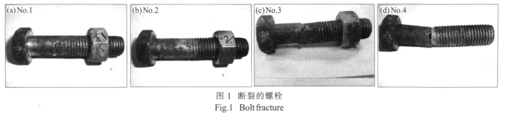 該法蘭上斷裂螺栓的圖片見圖1。在法蘭上共有四支螺栓,其中兩支斷裂,斷裂均發生在螺桿的非螺紋部分,如圖1(c)、(d)所示。