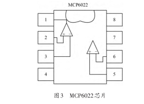 放大器電路主要采用的是MCP6022芯片,內部結 構如圖3所示。MCP6022是高性能的軌對軌輸人/輸出 運算放大器,帶寬為10 MHz,噪聲為8.7(10 kHz),低失 調電壓為±500~ ±250 pV,總諧波失真為0.000 53%,電 源電壓范圍為2.5 - 5.5 V,滿足系統的設計要求。