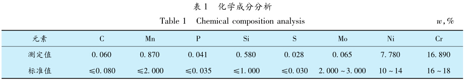 表1所示為化學(xué)成分分析結(jié)果,元素Mo和 Ni的含量不符合GB/T149764002《流體輸送用 無縫鋼管》標(biāo)準(zhǔn)的規(guī)定。另根據(jù)GB/T2224006 《鋼的成品化學(xué)成分允許偏差》標(biāo)準(zhǔn)之規(guī)定,Mo 質(zhì)量濃度的允許偏差是0. 1% ,而測量所得Mo質(zhì) 量濃度與標(biāo)準(zhǔn)質(zhì)量濃度的下限值偏差達(dá)到 1.93% ;Ni質(zhì)量濃度的允許偏差是0.15% ,測量 所得Ni質(zhì)量濃度與標(biāo)準(zhǔn)質(zhì)量濃度下限值偏差為22% ,故失效樣件的化學(xué)成分不符合標(biāo)示的 316SS (0Cr17Ni12Mo2)材質(zhì)規(guī)定。