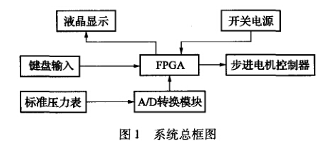 本系統采用基于Altera公司的Cyclone II系列 的EP2C35 FPGA芯片作為校驗系統的控制核心,負 責與外設的接口控制和自身的邏輯運算。因為標 準壓力表輸出的4 ~20mA是模擬信號,不能直接輸 人FPGA,通過AD轉換模塊,將模擬信號轉換成數 字信號,FPGA讀人壓力信號和通過鍵盤輸入的控 制命令,通過內部的基于模糊自整定PID算法,輸出一定的脈沖給步進電機控制器,驅動電機工作產 生需要的定點壓力,并經過液晶模塊實時顯示相應 的壓力數值。下面在系統總體組成框圖的基礎上 簡要介紹幾個主要部分的方案設計。系統總體組 成框圖如圖1所示。