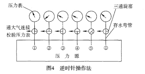 1)順時(shí)針操作法①—②旋塞向右旋90°,目的 是:沖洗存水彎管如在水壓試驗(yàn)時(shí)可裝接量程更大 的試驗(yàn)用表避免了工作壓力表的損傷;為第一操作, 此操作完成后存水彎管內(nèi)已被沖洗干凈然后才是第 二操作②—③旋塞須向右旋90°,實(shí)現(xiàn)校驗(yàn)用標(biāo)準(zhǔn)壓 力表、工作壓力表和鍋爐之間均接通的過程,目的 是:(1)校驗(yàn)壓力表;(2)可使堵塞在壓力表人口處有 污垢松動(dòng)脫落(此時(shí)存水彎管內(nèi)的壓力有少許下降, 同時(shí)產(chǎn)生輕微脈沖,造成壓力表表內(nèi)的壓力產(chǎn)生輕 微的波動(dòng)使堵塞在壓力表人處的污垢松動(dòng)脫落);當(dāng) 第三個(gè)操作③—④旋塞向右旋轉(zhuǎn)90。,目的是:(1)壓 力表指針回零位;(2)與壓力源隔絕,進(jìn)行壓力表的 卸換;(3)此時(shí)松動(dòng)脫落的污垢被壓力表內(nèi)的余壓沖 擊;第四個(gè)操作④—⑤旋塞右旋45。目的是:實(shí)現(xiàn)在 存水彎管內(nèi)凝結(jié)冷凝水,以避免高溫蒸汽損傷壓力 表;第五個(gè)操作⑤—①旋塞向右旋轉(zhuǎn)45°目的是:恢復(fù)正常。