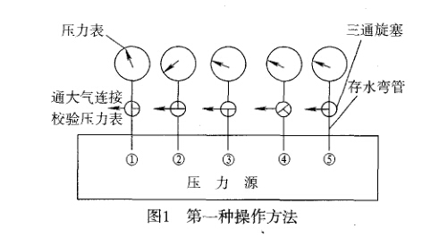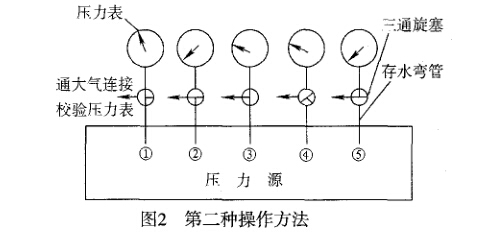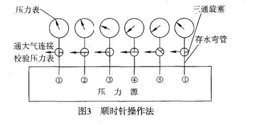 3)位置③連接標(biāo)準(zhǔn)壓力表時(shí)的位置:壓力表、 標(biāo)準(zhǔn)壓力表都和壓力源相通,壓力表和標(biāo)準(zhǔn)壓力表 均可指示讀數(shù),被校驗(yàn)壓力表根據(jù)標(biāo)準(zhǔn)壓力表讀數(shù) 進(jìn)行校核。