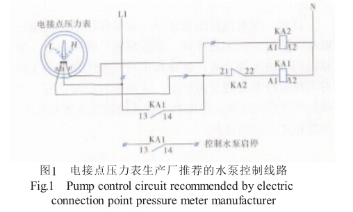 給水系統(tǒng)中的定壓系統(tǒng)是保持管網(wǎng)壓力恒定在一 定的范圍內(nèi),當(dāng)管網(wǎng)壓力低于某值時(shí)啟動(dòng)水泵加壓, 當(dāng)管網(wǎng)壓力達(dá)到一定值時(shí)停泵,如此循環(huán)。實(shí)現(xiàn)此功 能的測(cè)壓元件是電接點(diǎn)壓力表。電接點(diǎn)壓力表一般由 導(dǎo)壓系統(tǒng)(包括接頭、洋簧管等)、齒輪傳動(dòng)機(jī)構(gòu)、示 數(shù)裝置(包括指針與度盤(pán))、電接點(diǎn)裝置、外殼(包括 表殼、表蓋、密封墊圈、表玻璃等)、設(shè)定裝置和接線 插頭座等組成,外殼一般為氣密型結(jié)構(gòu)。其集壓力顯 示與控制于一起,設(shè)定調(diào)整方便。但電接點(diǎn)壓力表應(yīng) 用在管網(wǎng)定壓系統(tǒng)中,下述問(wèn)題不可避免會(huì)遇到,設(shè) 計(jì)控制線路時(shí)如不采取一定措施,無(wú)法保證安全、穩(wěn) 定運(yùn)行。一般設(shè)計(jì)的水泵控制線路如圖1所示。但應(yīng)用 到管網(wǎng)定壓系統(tǒng)時(shí)會(huì)存在以下問(wèn)題。