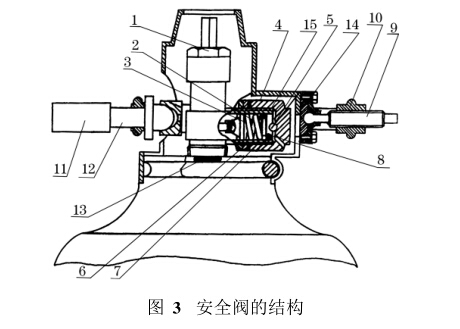 (3)安全閥的工作原理。安全閥由防松螺帽 6、螺帽7、錐形前閥座3、蝶形彈簧2、安全調壓帽4、 后閥座8、鋼球5等組成(見圖3)。