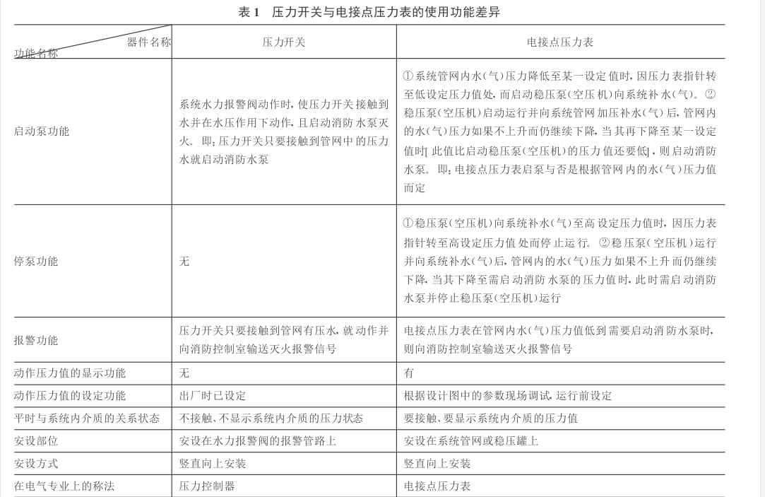 筆者目前在施工及調試中所遇到的混用情況,主 要是設計人員誤把壓力開關當作電接點壓力表使用。 這樣,就出現了滅火系統的穩(wěn)壓泵(空氣壓縮機)無法 實現在所設定的兩個介質壓力值上自動啟、停的運行 功能,從而導致施工單位在調試時重新更換上述器件 的后果。