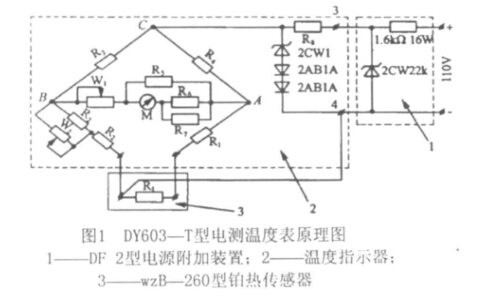 DF4B型內燃機車使用的電測溫度表為DY603- T型,它由 溫度指示器WB、WZB- 260型溫度傳感器WBf、DF2型電源附 加裝置DF等部件組成。圖1為其原理圖。