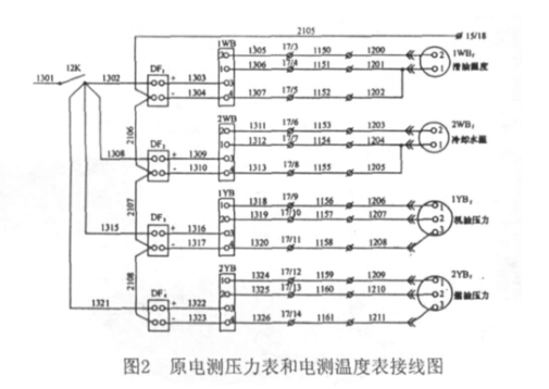 電測壓力表和電測溫度表電路原接線如圖2所示(此處只 畫出I室的接線圖,2室線號和接線柱號作相應改變即可,加改 線路也一樣)。