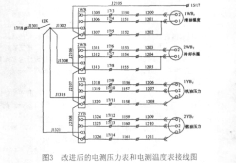 另外,改進的電路12K左側接X17/18,右側直接接到電測壓 力表和電測溫度表指示器3#接線柱上;各負端線的連接采用以 下方式:直接用導線將各電測壓力表和電測溫度表指示器4#接 線柱連接井引出一根線接到x 15/17上。為了能夠直觀區分各線 號又不與原線號發生沖突,可采用與原接線相同的線號,并加以 前綴J