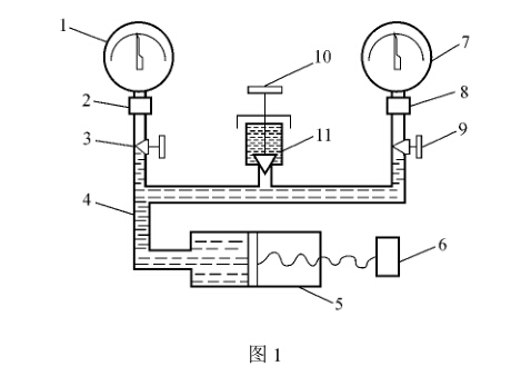 壓力表校準要使用壓力表校驗臺,現在普通使 用的壓力表校驗臺的結構原理如圖1所示’圖中1 為標準壓力表,2、為壓力表接頭,3、為針閥,4為 油管路’ 5為加壓泵’ 6為手輪’ 7為被校壓力表’ 10 為油杯閥,11為油杯。