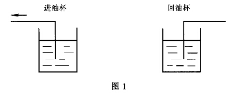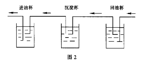 但兩個分離杯不能循環,在檢定工作過程中要頻繁 向進油杯內加入清潔介質,而從回油杯中不時倒出 介質。否則,將造成進油杯見底,而回油杯滿杯外 溢,工作起來十分不便。因此,解決辦法是利用3個 油杯,如圖2所示。