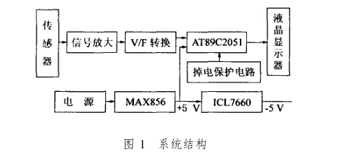 數字壓力表主要是由壓力傳感器與顯示電路所 組成,通過電纜連接。放大電路將傳感器輸出信號 放大并轉換成數字信號,經單片機處理后由液晶顯 示器顯示,工作原理如圖2所示。當被檢測對象受 壓力時,傳感器中的應變片會變形,從而引起電阻 變化,再通過對電位器Pi的調節來傳遞壓力信號。 其中必須得有個恒流源來提供它正常工作所需的電 壓。因為傳感器傳輸過來的信號是很小的,所以要 經過ICL7650放大。為了能夠更準確地得到壓力 值,該儀表增加了 TL062 二次放大,這樣采集到 的數據只是電壓信號,而單片機識別的是頻率信 號,所以電路中增加了 LM331作為V/F轉換,保 證了送到AT89C2051的信號是頻率信號,然后將 數據傳輸到顯示器。考慮到現場實時數據采集記錄 的不方便,該儀表軟件設計了存儲功能。另外在硬 件方面也增加了斷電保護電路,因為當儀表斷電的 時候,以前所儲存的一切數據都會丟失,但有了斷 電保護后儲存的數據就不會丟失了,當電池充電后 以前儲存的數據依然可以取出。