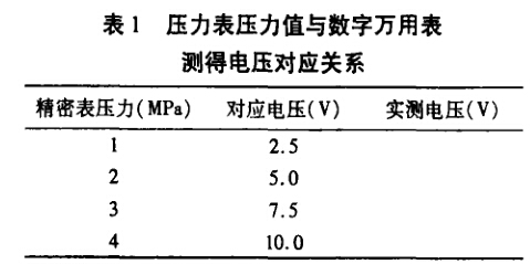 在進行各項校準之前,應首先對AK-4型壓 力傳感器進行校準。傳感器1、4接口連接24 V電 源,2、3接口并入臺式數字萬用表,壓力校驗器上 安裝0.25級(0~6)MPa精密壓力表,壓力校驗器 造壓,精密壓力表壓力值(MPa)與數字萬用表測得 電壓(V)對應關系如表1。