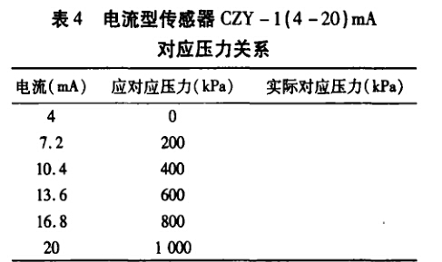 單擊桌面上“壓力表-電壓電流型”圖標,計 算機進人電壓、電流型壓力變送器及配套儀表校驗 主界面。選擇傳感器類型(如電流型CZY-1(4- 20)mA),單擊“傳感器校驗”圖標,進人電流型傳 感器校驗界面。將D030 - EG三用表校驗儀與試 驗臺測試線(電流型)相連,三用表校驗儀輸人一 個標準電流(mA),液晶顯示屏上“傳感器/壓力” 部分顯示一對應壓力(kPa)。對應關系如表4。