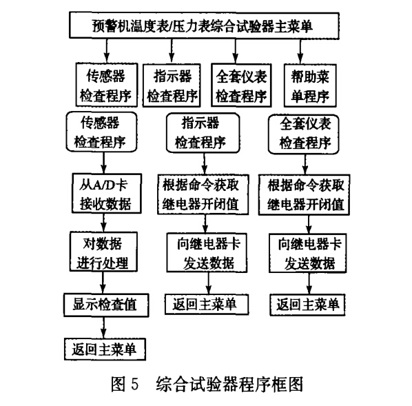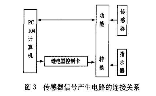 當(dāng)檢查指示器時(shí),程序可根據(jù)檢測(cè)的需要,通 過繼電器控制卡控制適配器轉(zhuǎn)換電路上相應(yīng)的繼 電器通或斷,實(shí)現(xiàn)溫度/壓力表指示器同計(jì)算機(jī)之 間的連接;與此同時(shí),繼電器控制卡控傳感器信號(hào) 產(chǎn)生電路,使其產(chǎn)生兩個(gè)高精度電阻,以模擬壓力 傳感器,其產(chǎn)生標(biāo)準(zhǔn)的傳感器信號(hào)加到指示器上, 來完成對(duì)溫度/壓力指示器的效驗(yàn),如果指示器指 示值在其誤差范圍內(nèi),則說明指示器工作正常,否 則故障。PC104采集卡還用于測(cè)量電壓/電流傳感 器輸出的代表被測(cè)儀表所需的電壓、電流大小,以 檢測(cè)供電電壓和儀表所消耗的電流是否符合要求。 電源包括3個(gè)直流電壓模塊,為設(shè)備提供所需電 源。