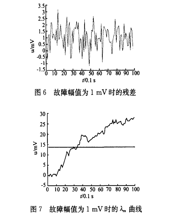 根據(jù)曲線分析,當(dāng)Am = 13. 96時(shí),A?>:rD1,說 明此時(shí)雖然部件故障幅值為1 mV,沒有超過規(guī)定 誤差值1. 5 mV,但在噪聲影響下,系統(tǒng)已經(jīng)故障。 如每0.1 s采樣一次,在3. 6 s時(shí)溫度表傳感器出 現(xiàn)軟故障。