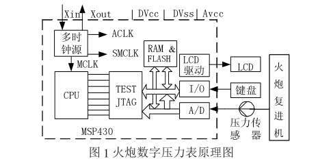 火炮數(shù)字壓力表硬件組成如圖1所示,所選用的CPU為美 國TI公司近幾年推出的MSP430系列單片機(jī),MSP430是一款 超低功率16位RISC混合信號處理器,硅面積比8051小 30%,功耗更低,在激活模式下耗電為250+A/MIPS,待機(jī)模式 下耗電為0.8+A。在單一芯片內(nèi)集成了 CPU、RAM&FLASH、 多時鐘源、液晶驅(qū)動、I/O驅(qū)動及A/D轉(zhuǎn)換等模塊,只需配上外 圍輸入輸出元件和電源模塊就可構(gòu)成完整的應(yīng)用系統(tǒng)。