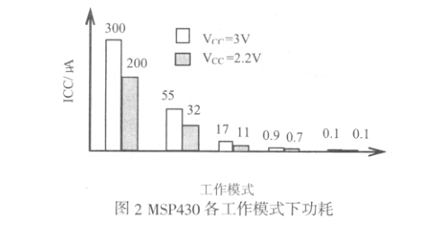 IAR Embedded WorkbenchEW430 環(huán)境是針對 MSP430 的 開發(fā)平臺,其功能非常強(qiáng)大。支持ANSIC和EmbeddedC++c MSP430有6種不同功耗的工作模式,可由軟件設(shè)置為活動模 式AM,低功耗模式0~4 (LPM0-LPM4)。活動模式功耗最大,其 他依次降低,中斷可將任一種低功耗模式喚醒,進(jìn)入活動模式, 中斷服務(wù)程序運(yùn)行后再返回中斷前的低功耗模式。各模式的耗 電情況如圖2所示。