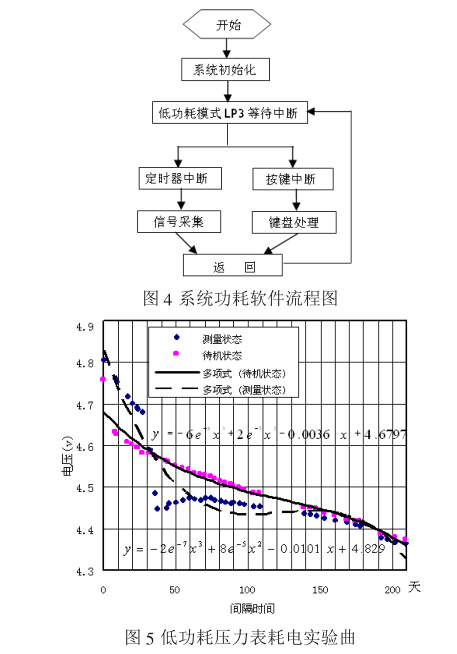 進(jìn)入該程序后首先打開傳感器供電電源,再采集輸入信號 進(jìn)行處理,最后關(guān)閉電源退出活動模式,整個過程約100ms。由 于系統(tǒng)大部分時間處于休眠狀態(tài),在活動狀態(tài)時間很短,系統(tǒng) 能耗得到顯著降低。系統(tǒng)功耗軟件流程如圖4所示