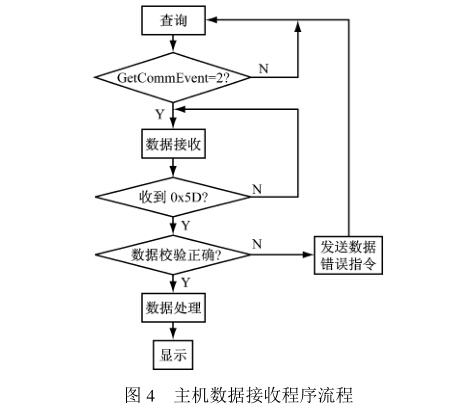 主機軟件的設計是基于VC + +平臺的MFC 編程實現。首先建立一個模態對話框,添加 MSComm控件,對所用計算機串口進行參數設置 及初始化。數據接收是通過對GetCommlvenl()事 件的響應,然后將數據校驗、保存并處理,在軟件前臺顯示。主機數據接收程序流程如圖4所示。