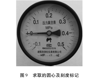 對刻度進行直線擬合后,選取每個刻度連通域 中擬合直線的中點或者該刻度連通域的質心,用于 標記其代表的刻度,便于后續讀數的計算。標記方 法:將所有的標記點按橫坐標分為圓心左邊部分和 圓心右邊部分,按照縱坐標大小不同,左邊部分從下 往上標記,右邊部分從上往下標記,即將表盤的刻度 從小到大依次標記完成,將標記的結果保存于數組 中,數組的索引為刻度的序號,數組值為該刻度對應 的角度(角度以表盤6點鐘位置為0度,順時針依次 增大)。圓心的結果和刻度的標記如圖9所示。