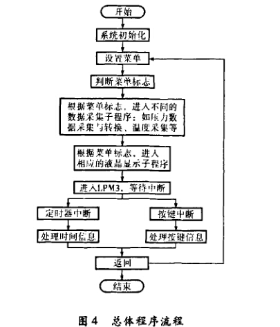 本系統采用分時數據采集的策略,即根據設 置的菜單情況,采集不同的數據信息,如壓力、溫 度及電池電壓等信息。以壓力數據采集為例,并 不是程序每循環一次進行一次壓力數據采集,而 是根據時間信息來采集。本系統程序設計為每 0.U進人一次時間中斷,在時間中斷中退出低功 耗模式3,進人活動模式,程序循環執行一次,然 后進人低功耗模式3(LPM3)。同時,程序循環執 行時對時間迸行判斷,如果間隔時間達到0. 4s, 讀取一次壓力數據,并進行A/D轉換。系統總的 程序流程如圖4所示。