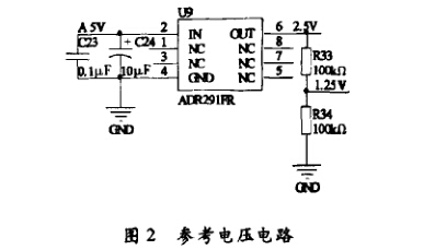 本系統采用的參考電壓由ADR291產生, ADR291是低噪聲、小功率參考電壓芯片。參考電壓 電路如圖2所示,其產生的2.5V參考電壓精度在0. 12%以上,滿足本系統高精度的要求。輸出2.5V經 過電阻分壓后產生1. 25V作為A/D芯片的參考電 壓,為提高A/D芯片參考電壓的精度,圖2中的R33 和R34均采用l%o的高精密電阻。