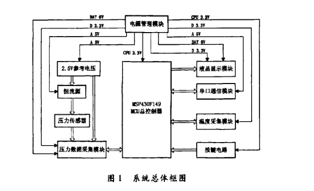 本系統旨在設計一款高精度微功耗的數字壓 力表,因此髙精度和微功耗是本設計的重點和難 點,必須從總體設計時就加以考慮。系統總功耗 一般包括元件級功耗和系統級功耗⑴,需要從這 兩方面人手才能達到系統微功耗的目的。