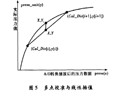 本系統最終采用11點校準的方式,即滿量程 的0%, 10%, 20%,…,100%,校準完成后,將校 準數據存人Flash數據存儲區。計算 當前壓力值時,首先將得到的當前壓力數據與校 準數據比較,得到當前壓力數據所在 的區間,采用線性插值的方法計算當前壓力值: