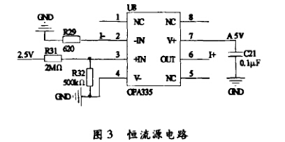 恒流源電路的核心芯片是OPA335,此芯片是 自動置零,單電源運算放大器。具有最大5(|^的 失調電壓,285RA的靜態電流,同時滿足了系統高 精度和微功耗的要求。恒流源電路如圖3所示, 利用運算放大器“虛短”和“虛斷”的特性設計,其 中電阻R29、R31和R32均采用1%的高精密電 阻,產生806皡的恒流源,【+和I-分別是壓力 傳感器的正、負電源輸人端。經測試,此恒流源在 負載阻抗低于5kO時,穩定可靠,滿足本系統壓 力傳感器的供電要求。