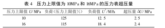 超壓實(shí)驗(yàn)中,壓力上限值U<160MPa時(shí),當(dāng)U增 加,如應(yīng)單調(diào)遞增,但事實(shí)并非如此。按照表2的計(jì)算 方式,壓力上限為10MPa和16MPa的壓力表超壓實(shí)驗(yàn)負(fù) 荷值以及超壓量計(jì)算結(jié)果見(jiàn)表4: