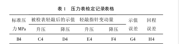 (6)規(guī)程附錄A“壓力表檢定記錄基本格式”的表格 在“回程誤差”列前增加“示值誤差”列,采用excel壓力表 數(shù)據(jù)自動(dòng)處理模塊進(jìn)行數(shù)據(jù)處理。