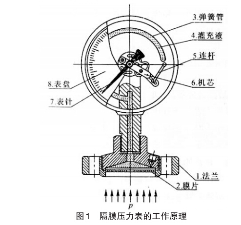 隔膜壓力表由各種通用型壓力儀表和不同結構 的隔膜隔離器組成一個封閉系統,內部充密封液。當 被測介質的壓力作用于隔膜時則隔膜產生變形,壓 縮封閉系統內部填充的密封液。通過密封液的傳導 使壓力儀表中彈性原件的自由端產生相應彈性形變 位移,經指示裝置顯示壓力值。隔膜壓力表的丁作原 理如圖1所示。