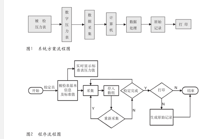 整個測量系統由硬件和軟件兩部 分組成,主要工作流程是利用數字壓力 校驗儀測量被檢壓力表加壓在檢定值時 的壓力值,通過RS-232數據采集設備將 檢定值傳輸至計算機,采用上位機程序 對所采集數據進行計算、分析和處理,根 據需要生成原始記錄并打印。系統方案 流程圖如圖1所示。