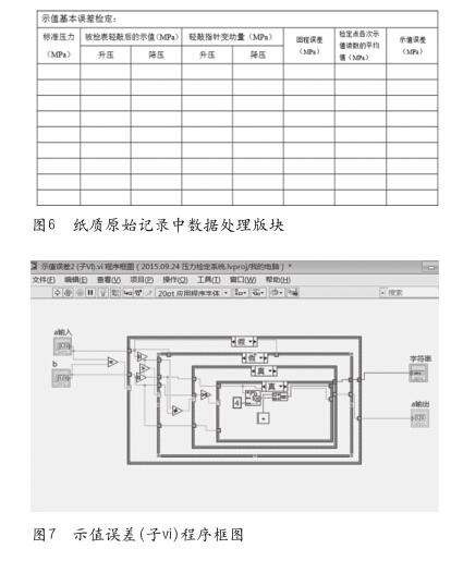 根據精密(一般)壓力表的國家檢定 規程,對被檢壓力表實施檢定后需對檢 定結果進行分析及處理,主要是獲得回 程誤差、平均值和示值誤差,紙質原始記 錄中的數據處理板塊如圖6所示。在上位 機程序編程的實現過程中,回程誤差及 平均值比較簡單,而示值誤差比較復雜。 本系統自主編寫了示值誤差子vi,能夠準確地進行示值誤差計算,該子^的程序框 圖如圖7所示。
