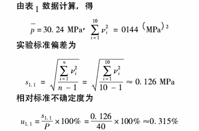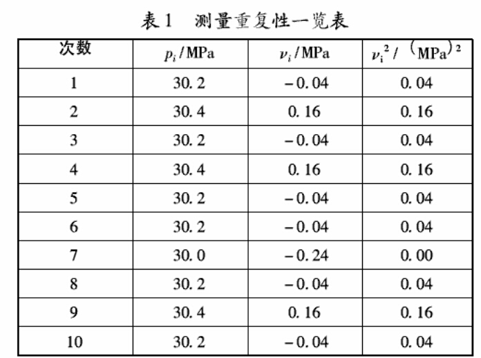 值誤差最大點30 Mpa,在該點重復測量10次,以該點的 測量重復性來估算其相對標準不確定度。如表1所示。