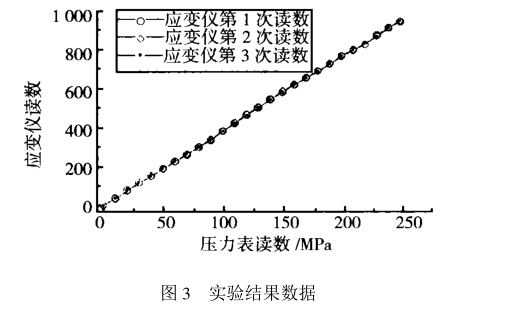 本次試驗采用的壓力表精度等級為2. 5 ,量 程250 MPa.溫度為室溫20 ±3 C.應變片接入方 法為3.3.2中的接入方法,即采用一個工作片和 一個溫度補償片的方式.本次試驗共重復進行了 3次,3組數(shù)據(jù)如圖3所示.由圖3可以看出管壁 的伸縮變化率與管內(nèi)壓強呈線性變化,且數(shù)據(jù)具 有良好的重復性.本測試受條件限制未使用高精 度的壓力表,并且應變片敏感柵尺寸過大,使得實 驗結果的精度受到一定影響.
