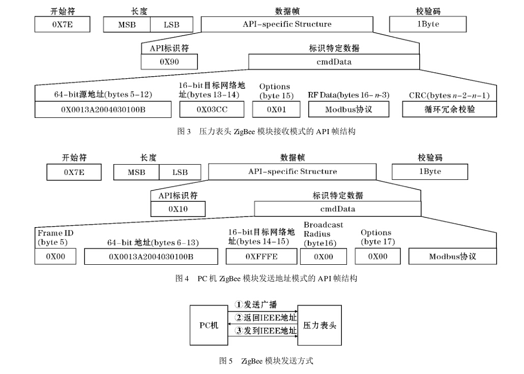 由于受到石油礦井工作規程限制,為了使壓力表方便操作,采用ZigBee模塊間無線通信方式,實現標定 軟件與壓力表的數據傳輸,校正壓力表傳感器的精度,保證計量的準確性。這就要使基于數據鏈路層的Modbus 議與基于網絡層的API模式下ZigBee進行通信,采用在Modbus的基礎上加上API的協議層的方法來實現。實驗 結果表明,無線通信模式提高了傳輸數據的準確性。