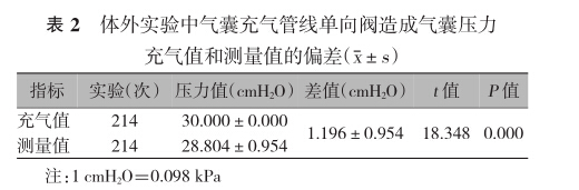 2.1.2充氣管線單向閥造成氣囊壓力充氣值和測量 值的偏差(表2):經過214次的反復實驗,得到氣囊 接口單向閥斷開和連接造成氣囊壓力充氣值和測量 值之間的偏差,差異有統計學意義t=18.348P= 0.000)